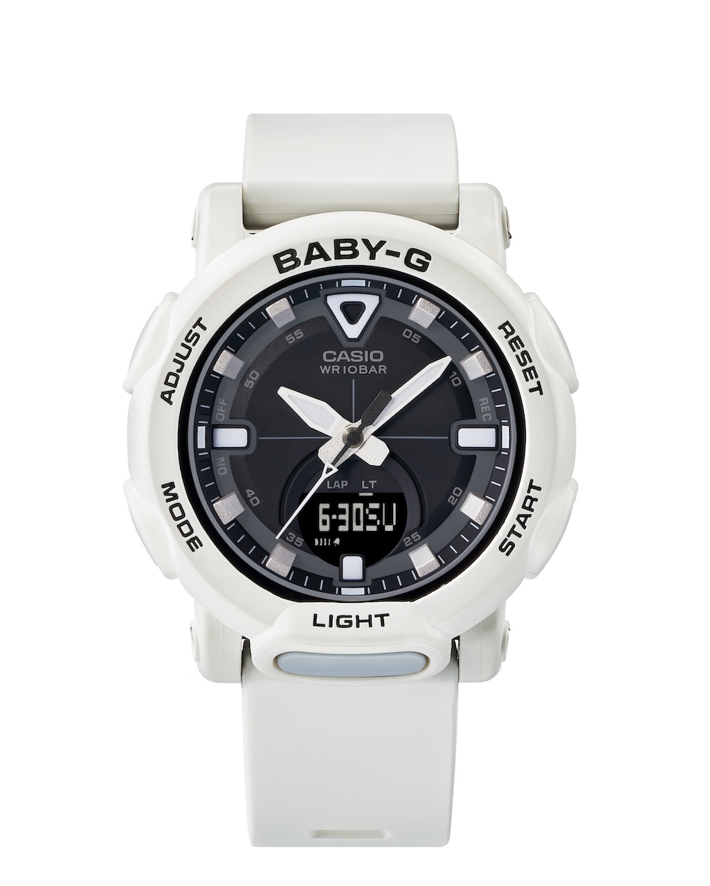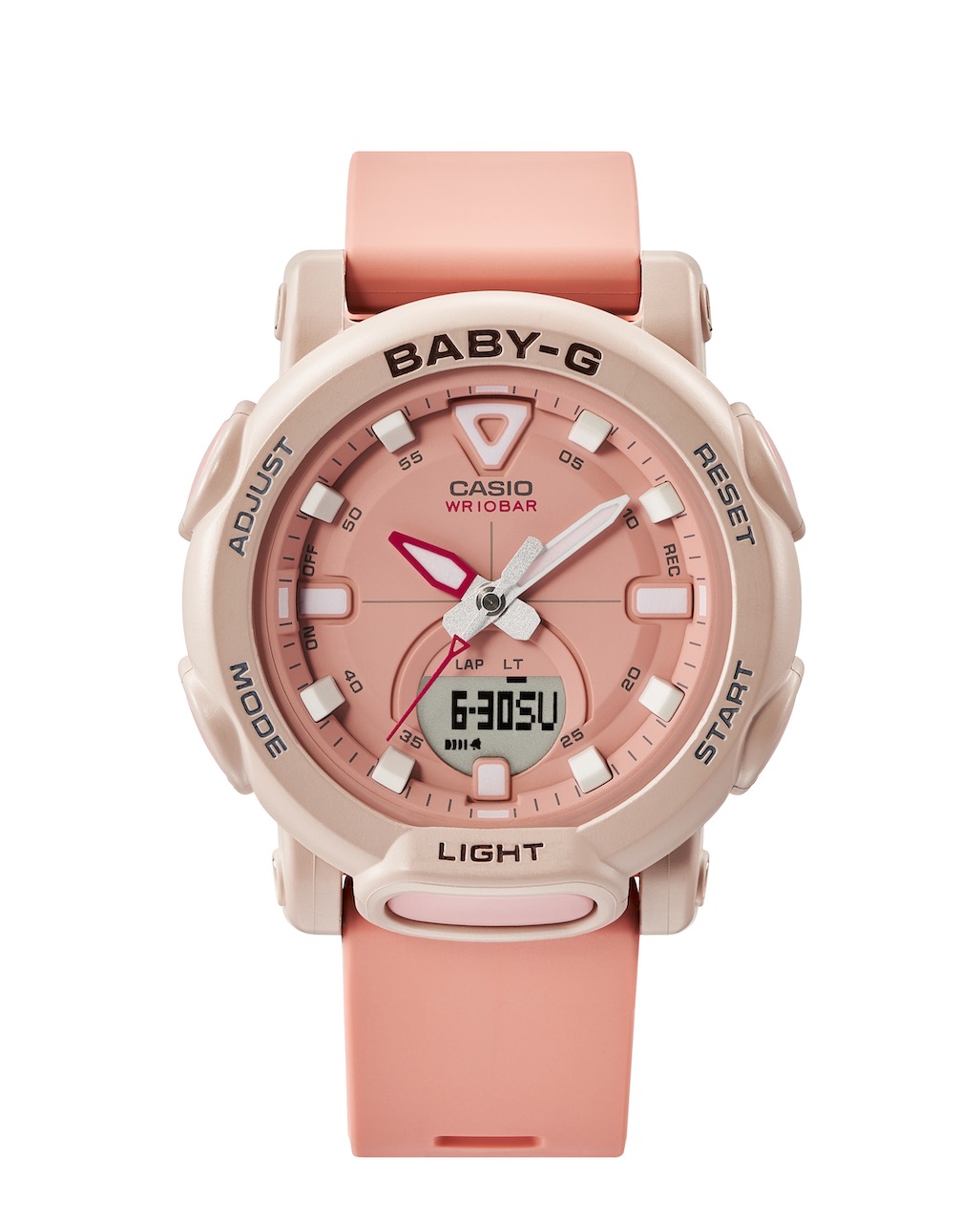 All six BGA-310 series watches have a high-intensity double LED light that illuminates the LCD and dial for an easy read in dark locations. The lights can be switched on by pressing the easy-access light button under the 6 o’clock position. There is also the auto-light function that gives you hands-free. When this function is set, just a tile of the wrist lights the watch. This would be great for a camper and an outdoor adventurer, who would definitely appreciate it when both hands are occupied.