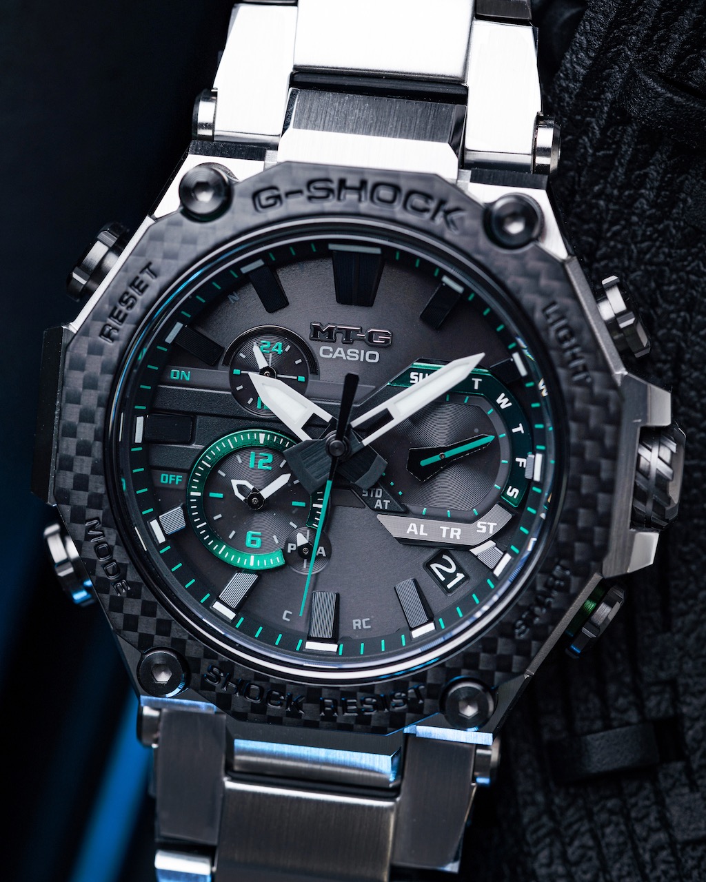 As for the MTG-B2000XD, the bezel top has a complex shape made by using advanced pressing and cutting processes on the multilayer carbon material. The side view of the bezel reveals fibre glass layers in an all-new original green, giving the watch a sporty and refined look.
