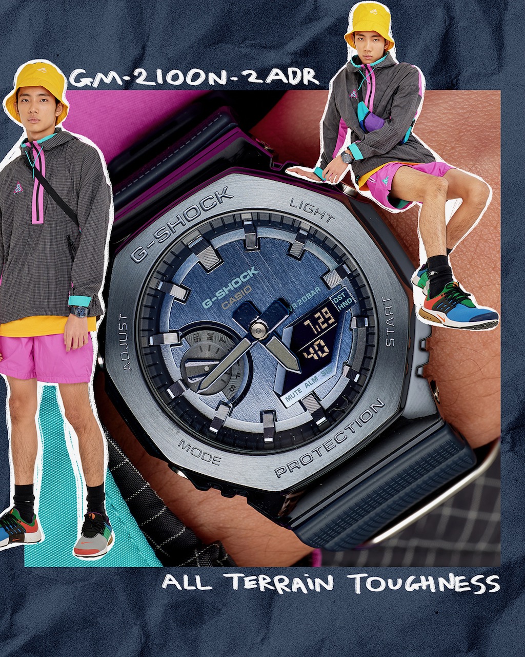 G-SHOCK presents the GM-2100 Style File – a visual style kaleidoscope featuring the new GM-2100 and GM-S2100. The distinct and stylish line of shock-resistant watches are your new daily essentials for a day out in the city, any outdoor activities, and whenever you are hitting the streets to explore your creativity. Style it up or wear it casually, there are no limits to coordinating your own fashion fits with these watches.