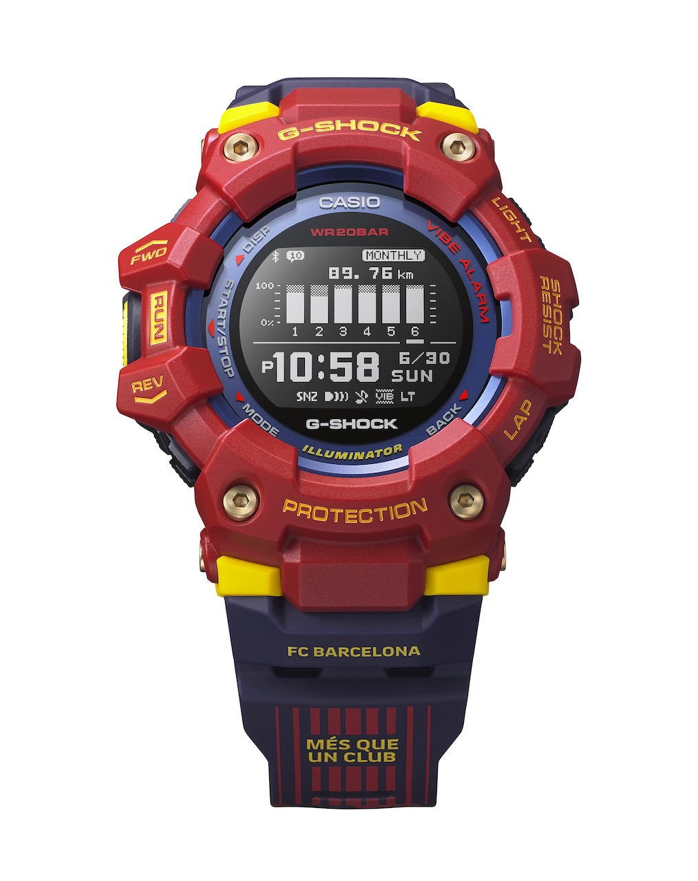 The G-SHOCK watches GBD-H1000 and GBD-100 are the base models for the two new watches, they are both from the G-SQUAD lineup. The new models employ the blue and garnet team colors of FC Barcelona. The bands, designed to evoke past and present team uniforms, are imprinted with the club motto, “Més que un club” (“More than a club”) in the local Catalan language.