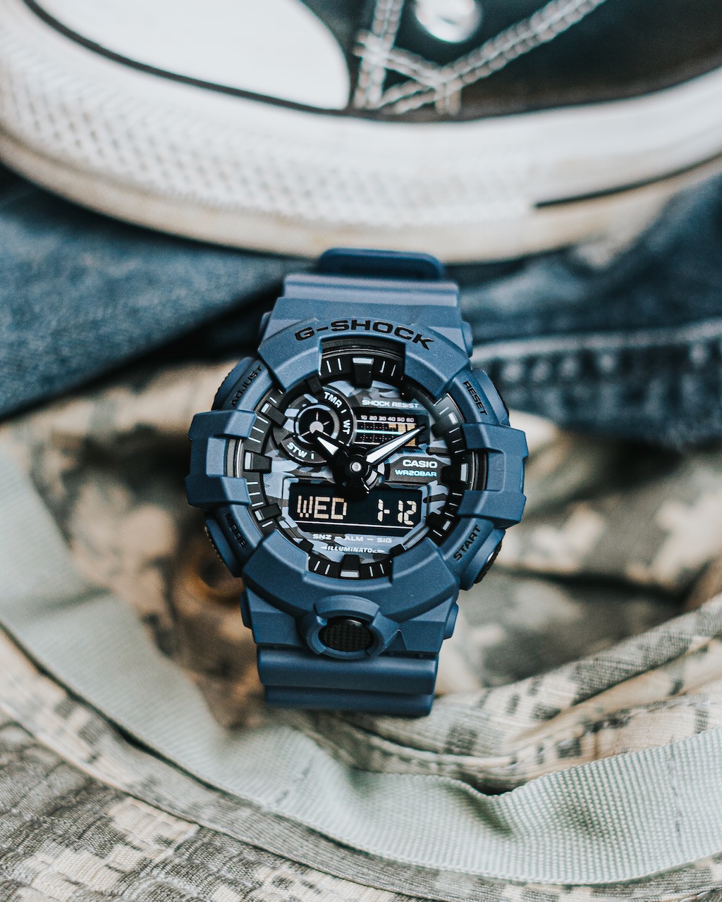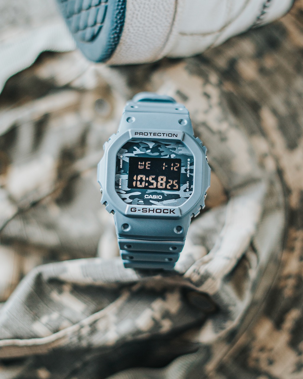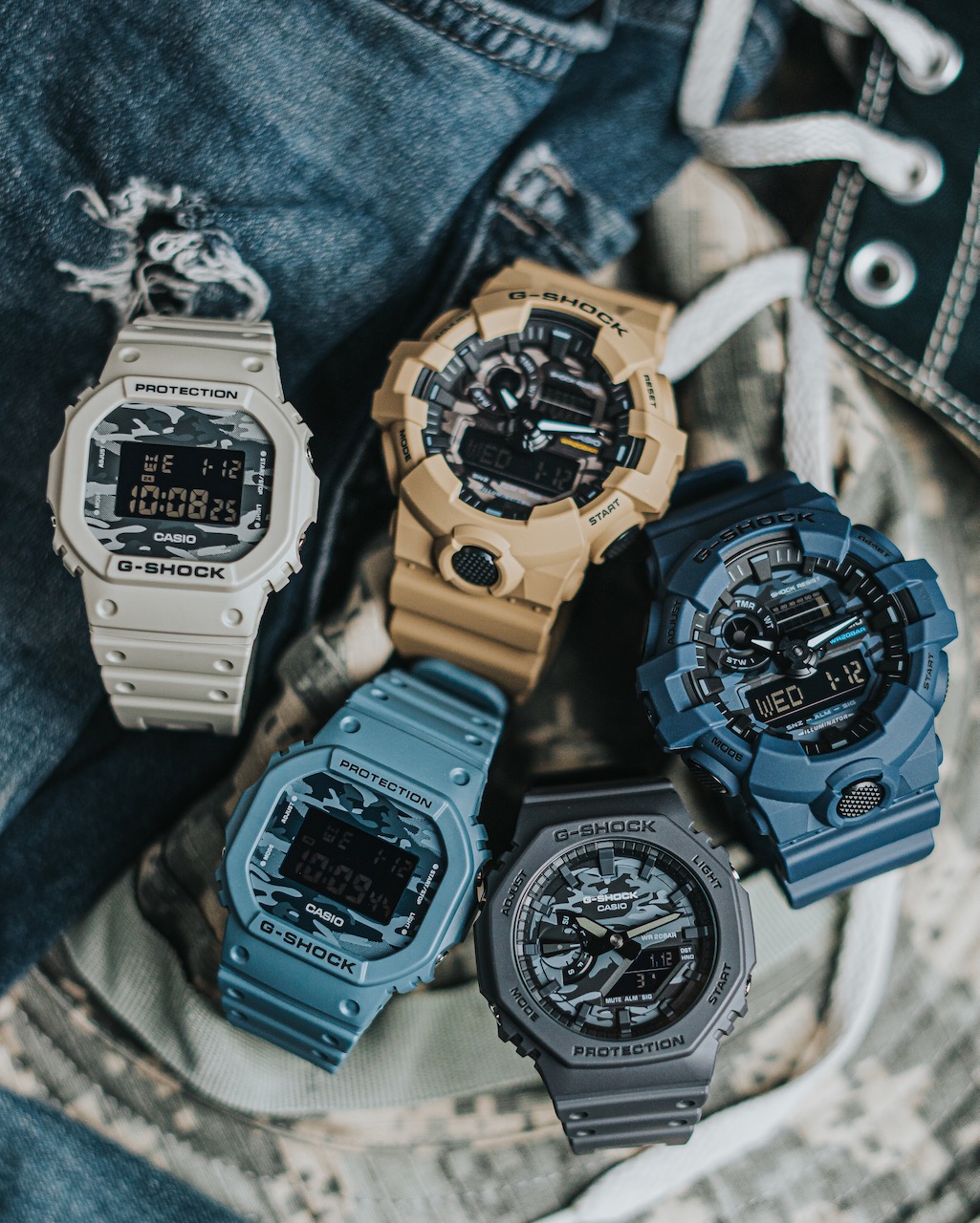 G-SHOCK recently announced a new series, the new G-SHOCK Camo Dial Utility series. This series has a camouflage pattern on the faces with minimal colours. The watches from this new series are based on three base models: the standard square case DW-5600, the GA-700 with a round case and a distinctive front button, and the thin octagon case GA-2100. There are five different colorways applied: Blue-gray, gray, navy, brown, and dark gray. For outdoors and fashionistas, all the watches of this series go well with street fashion, outdoor wear, sportswear, and other casual styles.