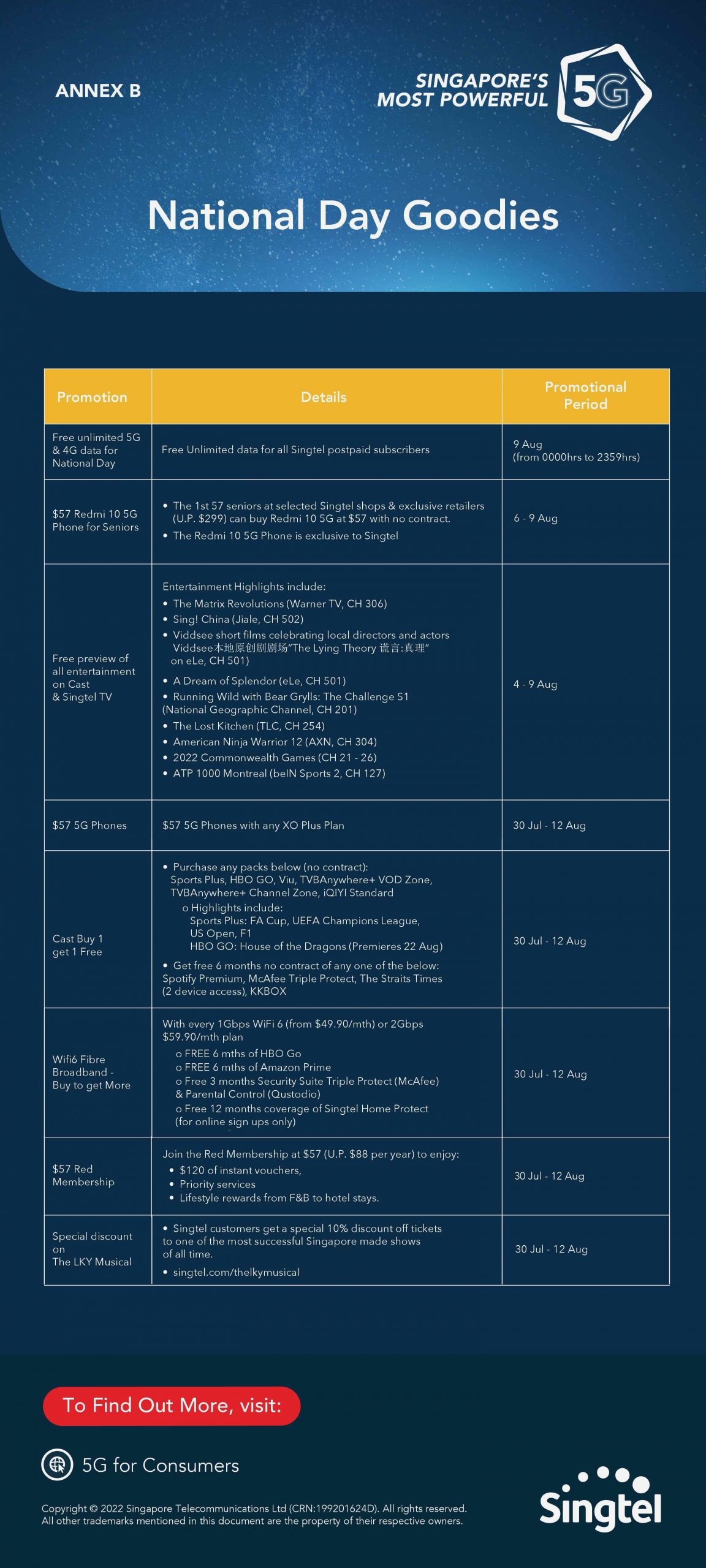 To celebrate this national 5G milestone, Singtel is giving customers a range of NDP exclusives including unlimited 5G data on 9th August, as well as free access to the full range of programmes on Singtel CAST and Singtel TV from 6th to 9th August. Seniors will also get to purchase the latest Xiaomi Redmi 10 5G phone for just $57 during that period.