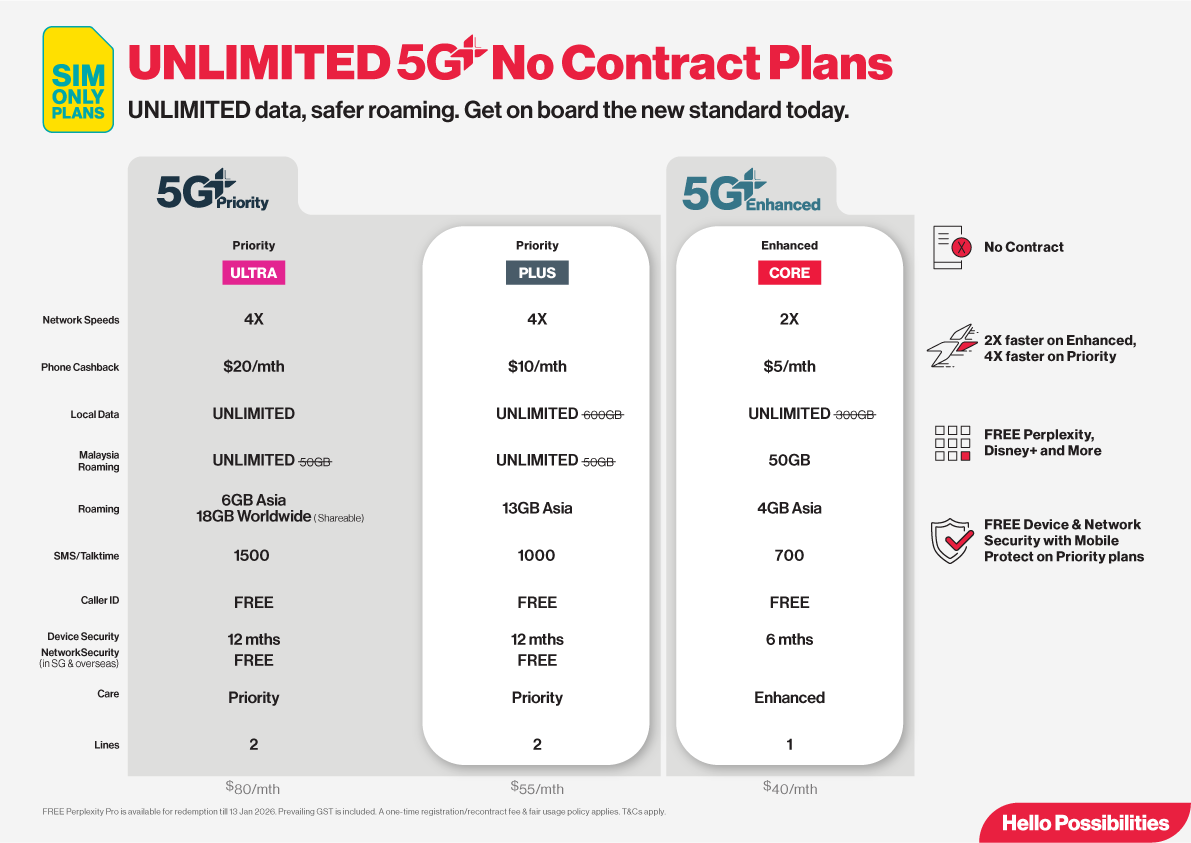 The holiday cheer also applies to no-contract, SIM-only plans. Even the base $40/mth 5G+ Enhanced Core plan now comes bundled with unlimited local data (up from 300GB), a new 50GB Malaysia data roaming (none previously) and 4GB Asia roaming (up from 1GB).
