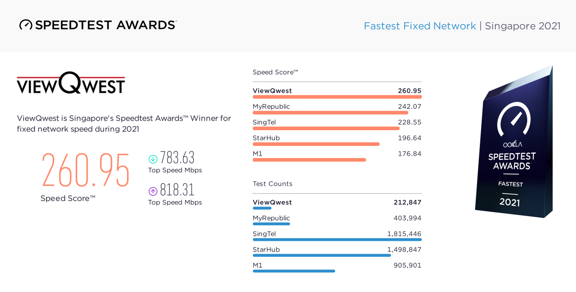ViewQwest is Singapore’s fastest broadband provider in Year 2021. For the fourth consecutive year, ViewQwest has been awarded Singapore’s fastest fixed broadband provider by Speedtest® by Ookla. Singapore is accelerating adoption of a highly digital lifestyle, ViewQwest continues to maintain its fastest broadband service provider status while catering to the ever-increasing bandwidth needs of Singapore as consumers make a huge shift towards working, streaming, entertainment and gaming at home due to the pandemic situation.