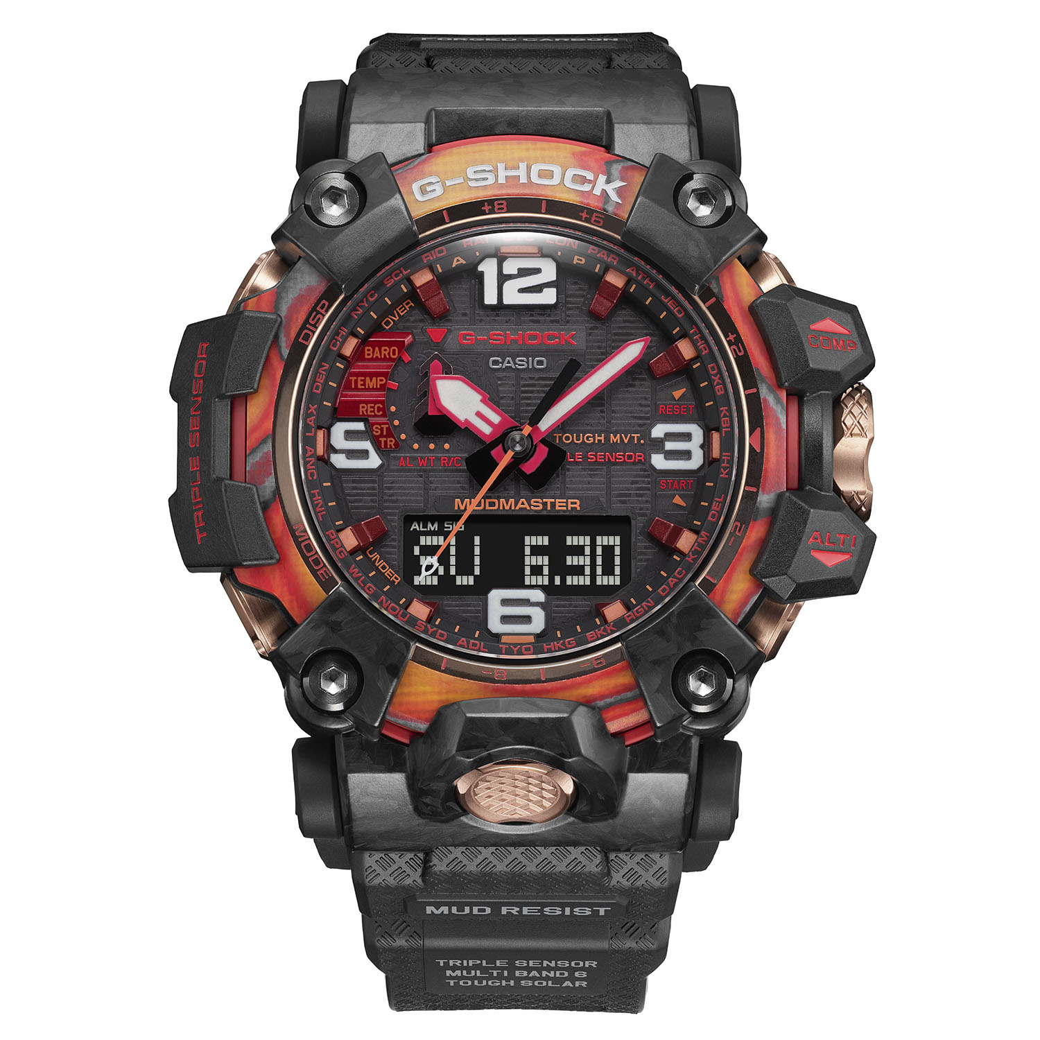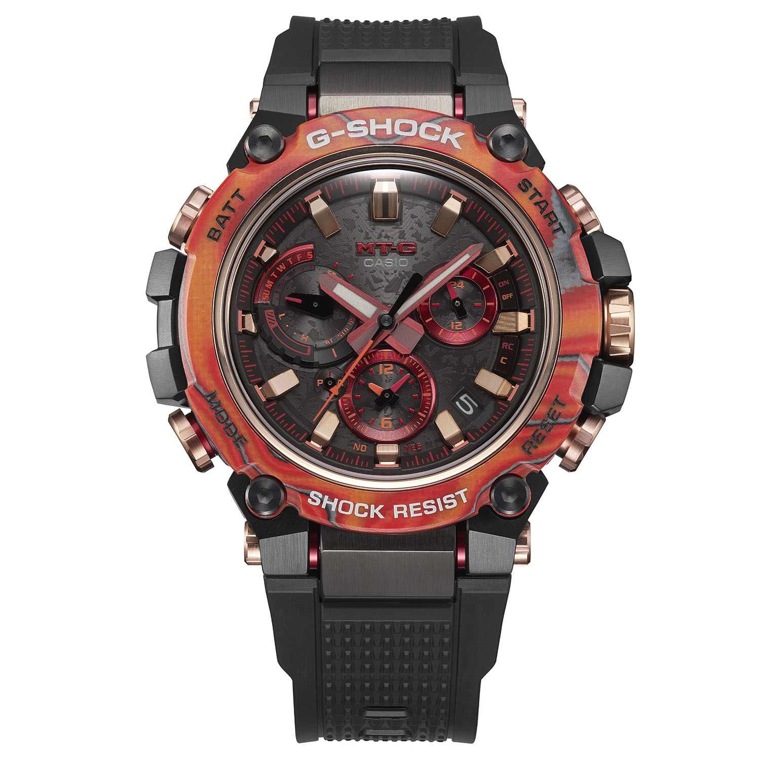 Based on the concept of a powerful solar flare, the MTG-B3000 and GWG-2000 are designed using new technology and dressed in G-SHOCK’s brand colours of red and black. The colour scheme draws from fieriness of the sun and its illuminating rays, applied to a multi-colour insert bezel created from the delicate process of stacking multiple layers of carbon and glass fibres.