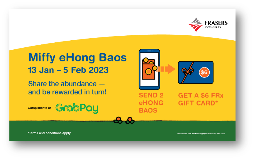 In partnership with GrabPay, each FRx member can send Miffy eHong Baos to 2 unique recipients in a day and get to receive a $6 FRx Gift Card per day. An in-app confirmation will be sent when the $6 FRx Gift Card is successfully auto-credited to the member’s FRx e-wallet.