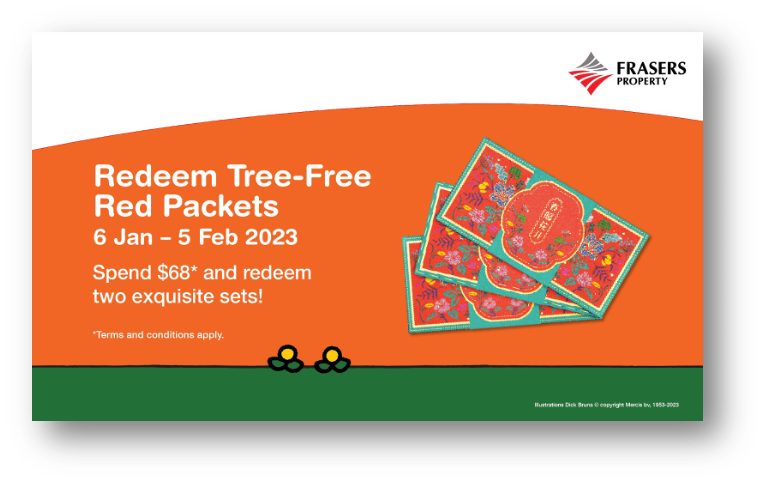 From 6 January, spend a minimum of $68 to receive two sets of tree-free red packets! To find out more about these tree-free red packets, visit