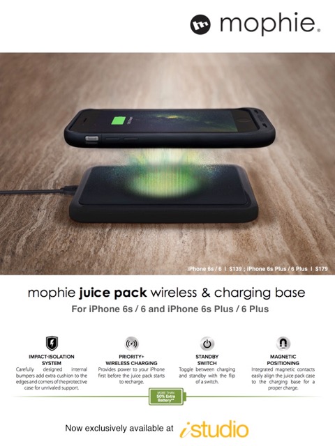 The mophie juice pack wireless for iPhone 6s/6 and iPhone 6s Plus/6 Plus is now available exclusively at iStudio, retailing at $139 and $179 respectively.