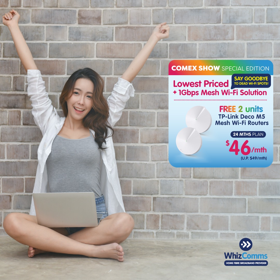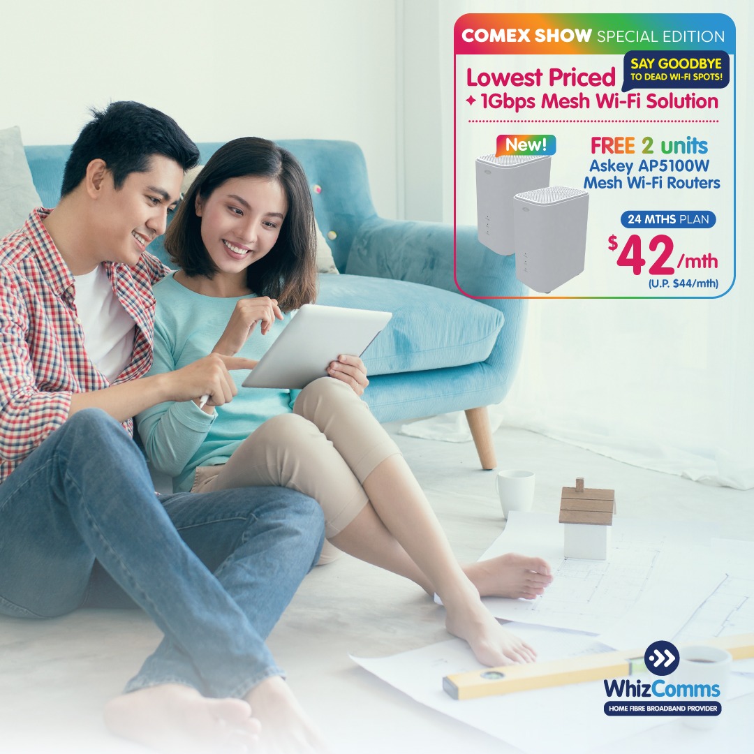 – Free Home Digital Line Service – Free WhizComms’ Activation Fee (worth $53.50) – Free Weekday (9am to 530pm) Delivery & Installation (worth $53.50) – Free 12 months subscription to ESET NOD32®Antivirus (Windows) & Mobile Security (Android), (worth up to $29.90) – Free Onsite Wi-Fi Audit Service for any subscription to Mesh Wi-Fi router plans